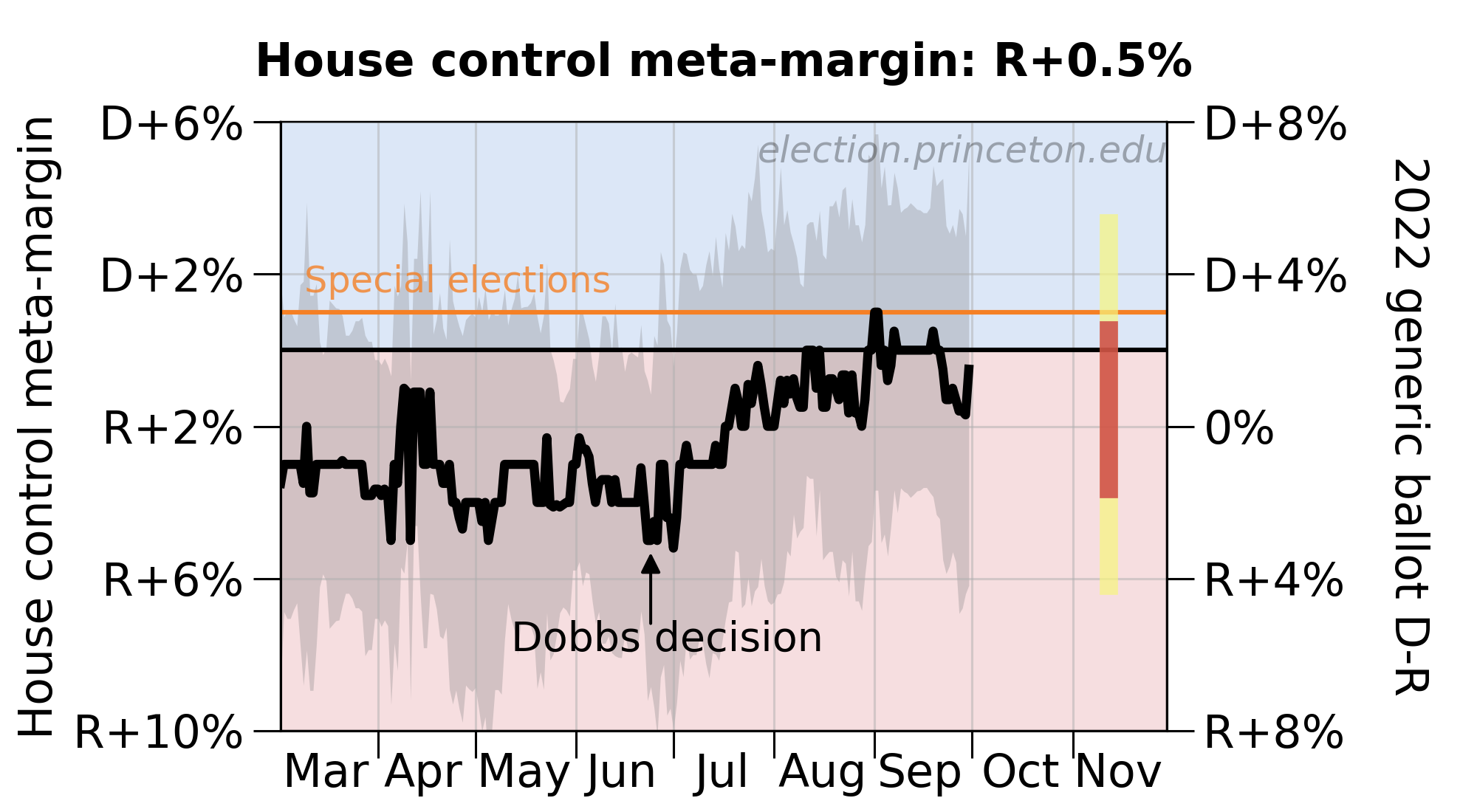 The right axis shows generic polling margins, which are pretty predictive of the eventual national vote. The left axis is shifted to account for the Republican advantage in redistricting. The difference between these axes is only about 2 points, as I wrote in August (also see Nate Cohn’s recent column), which means that the U.S. House is a fairly level playing field this year. (State legislatures are a far more variable story.) If you want to know who is favored to win control of Congress, look at the blue and pink zones.