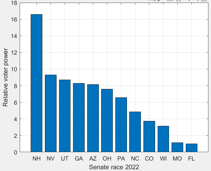 This is pretty interesting! As expected, voters in some states with close Democratic leads have powerful voters: Georgia, Ohio, Pennsylvania, and North Carolina. But New Hampshire, Nevada, and Utah voters are even more powerful. Why is that?
