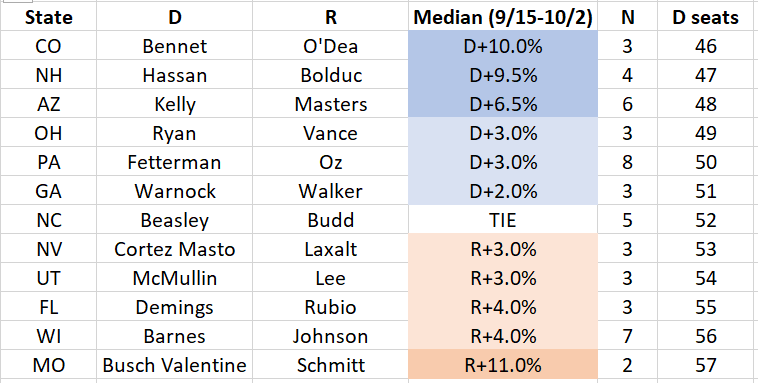 Those 49th, 50th, and 51st seats in the table, currently Ohio, Pennsylvania, and Georgia, are going to be quite important. If polls are off by, say, 3 points, every vote in those states will be pivotal.