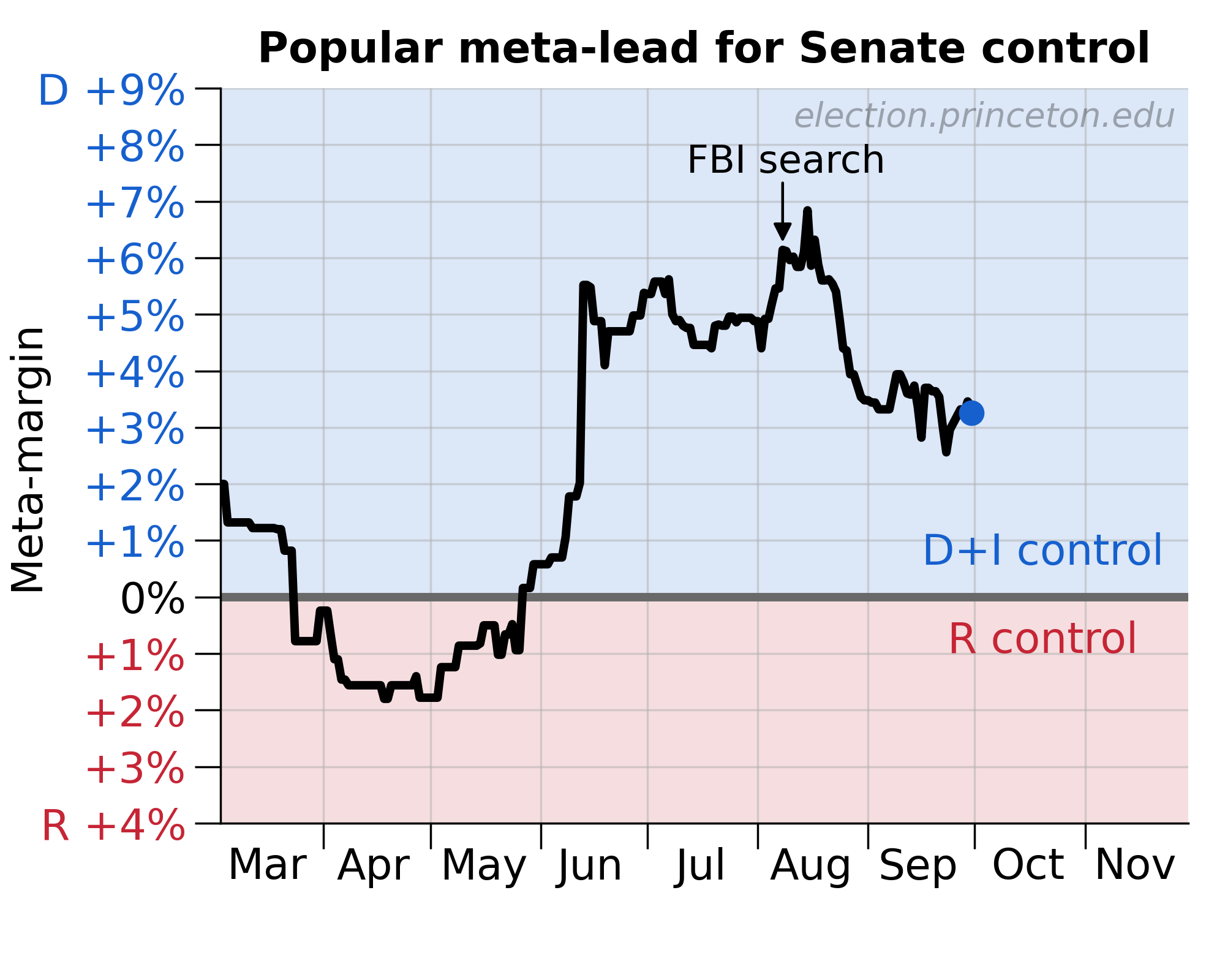 In this calculation, a key quantity is the meta-margin. That’s how much polls would have to swing overall, or be in error overall, to make control a perfect tossup. As of today, the Senate Meta-Margin is Democrats ahead by 3.3%.